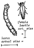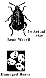 INJURY: In the field, kidney beans, lima beans and cow peas are attacked. In storage all varieties of beans, peas, lentils and some seeds are attacked. The larvae feed inside the beans and when numerous, nothing but the shell remains. This reduces the food value of the beans as well as reducing the germination potential of the bean seed. DESCRIPTION: |