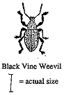 The adult is a black wingless weevil (snout beetle) about 3/8 inch